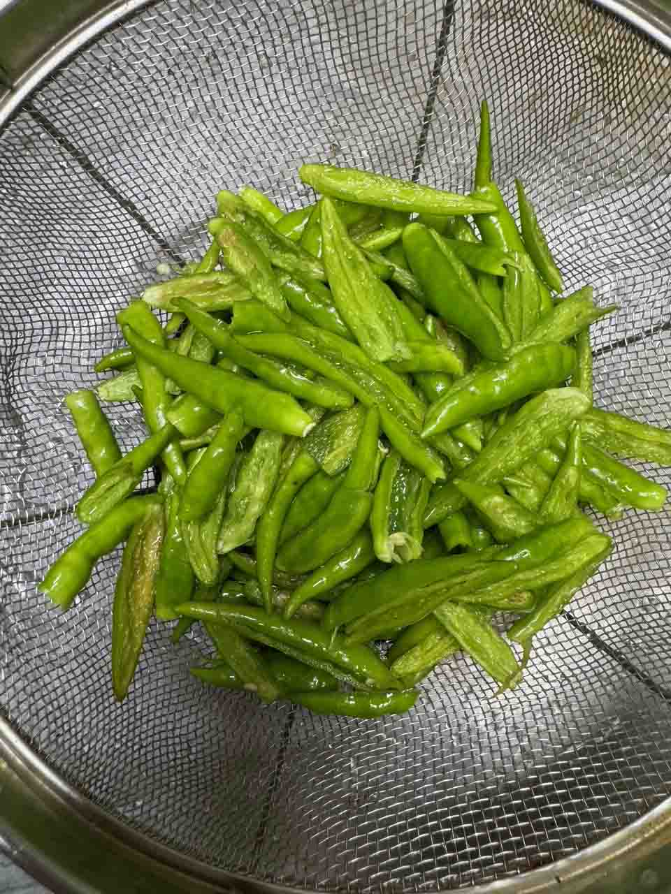 - 青とうがらしを茎から取り、ヘタやタネを取り除く。